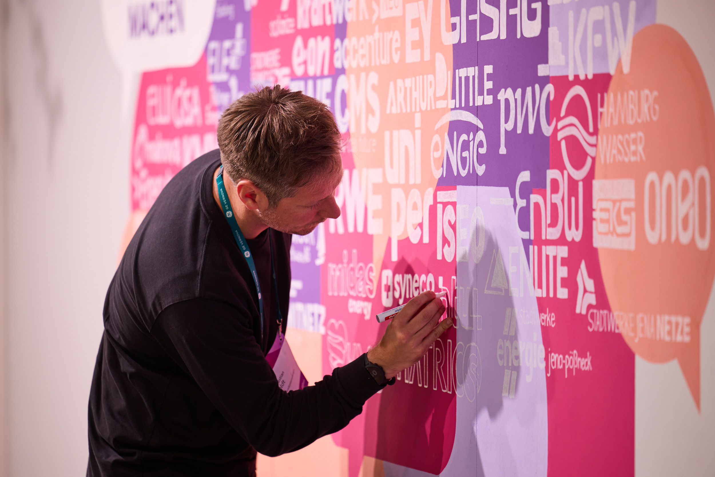 ein Künstler zeichnet die Logowand des BDEW Kongress 2024