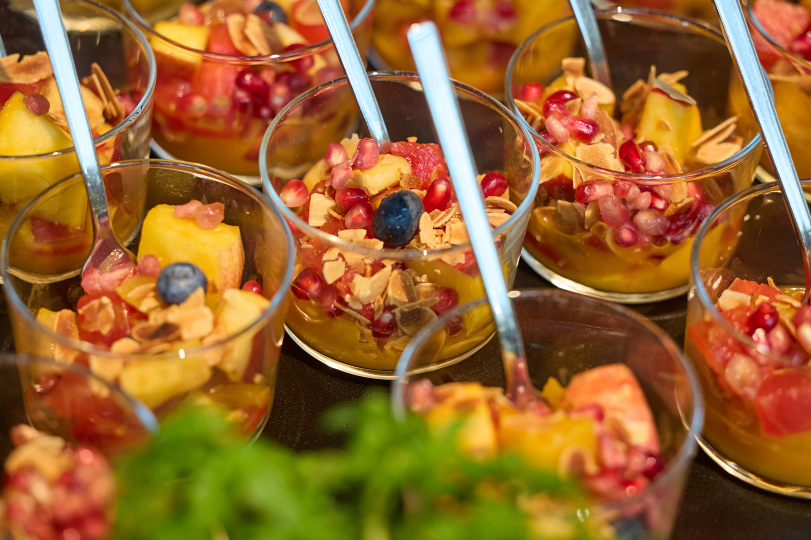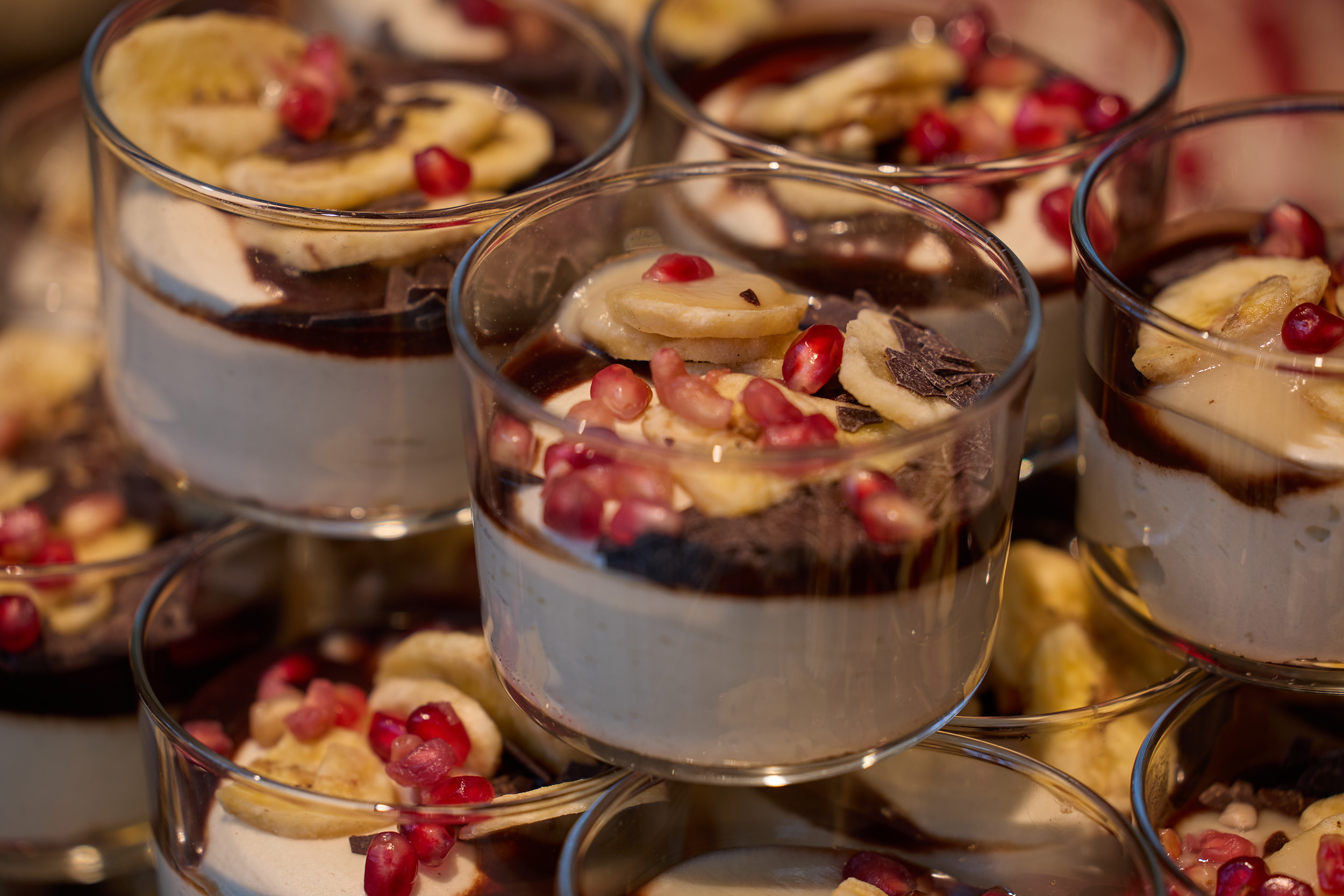 eine Reihe gefüllter Cocktailgläser auf einer Bar