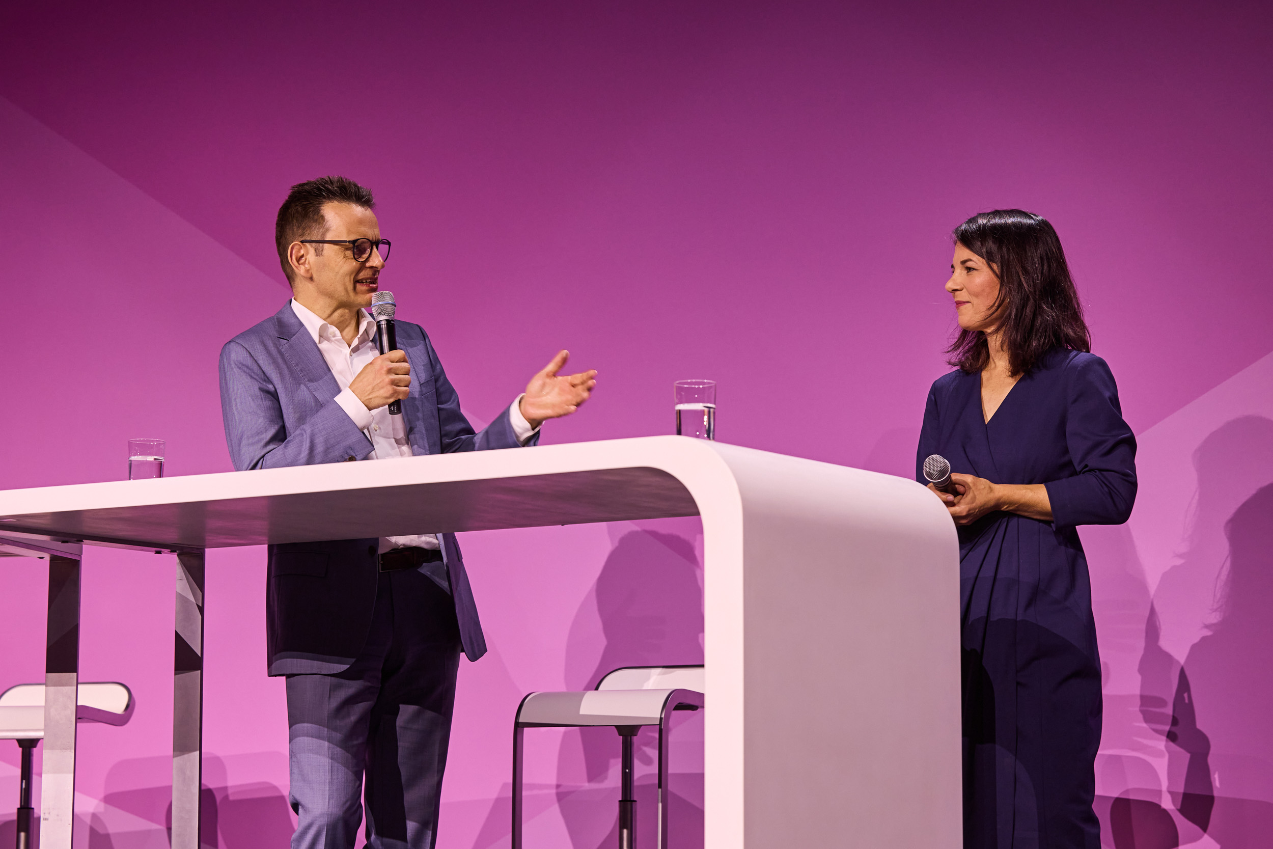 Leonhard Birnbaum diskutiert mit Annalena Baerbock auf der Plenumsbühne des BDEW Kongress 2024
