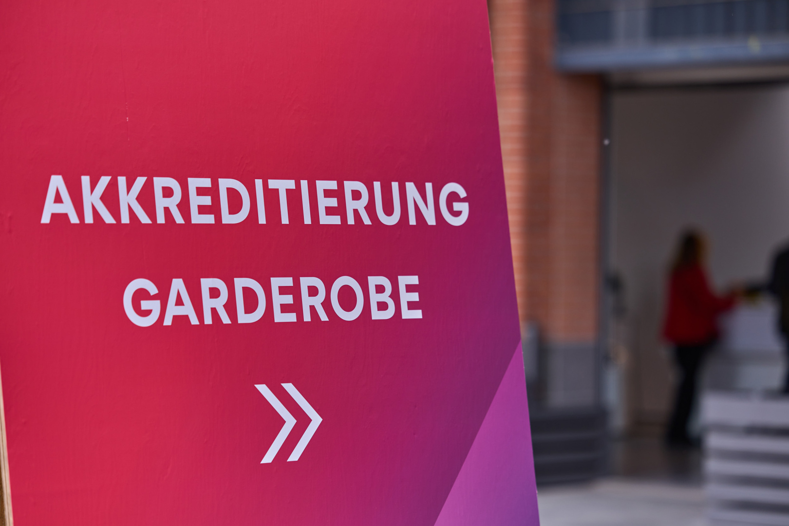 Schild im Design des BDEW Kongress 2024 mit der Aufschrift "Akkreditierung Gaderobe"