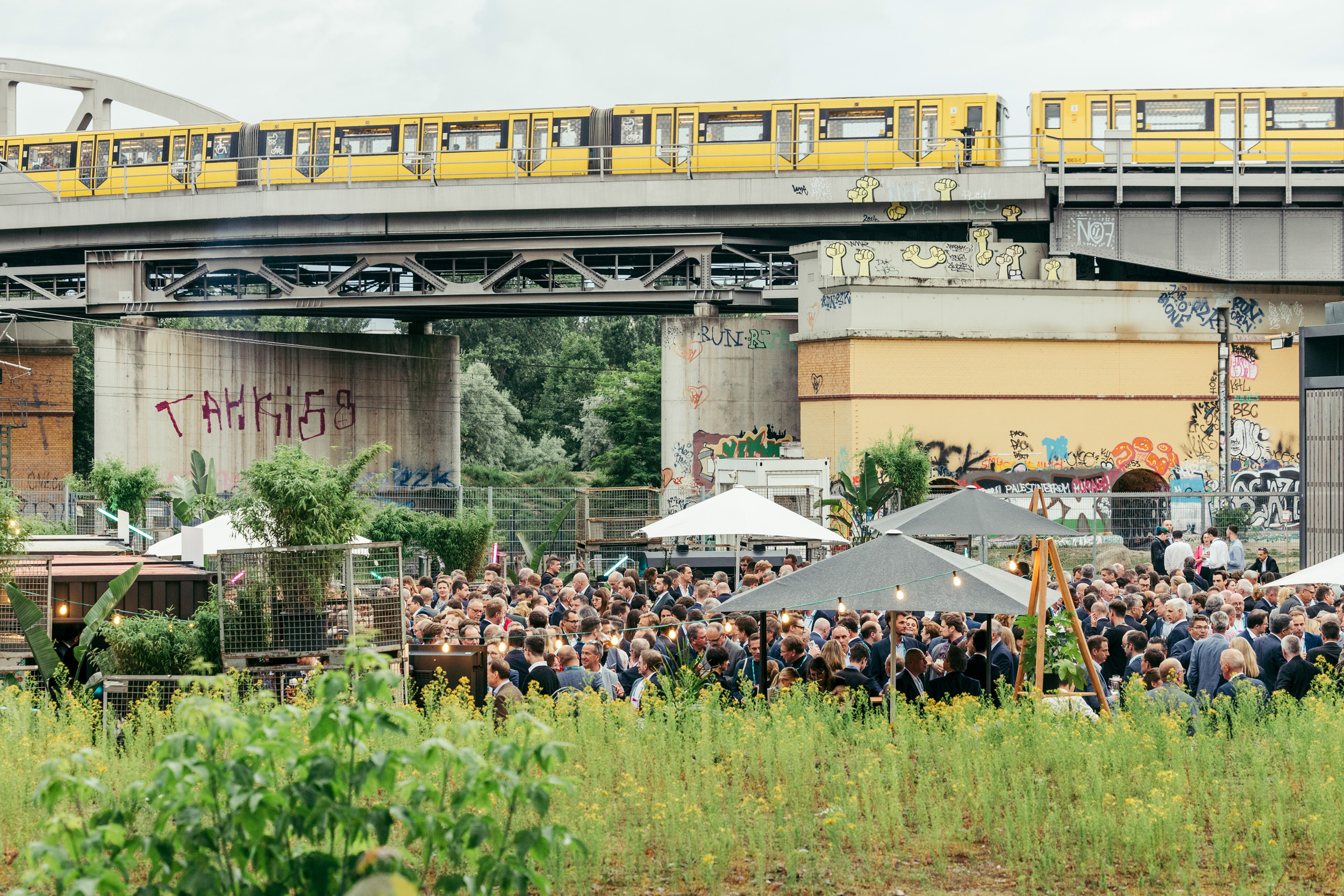 Eine Fahne mit der Aufschrift "BDEW Kongress" weht am Eingang zur STATION-Berlin